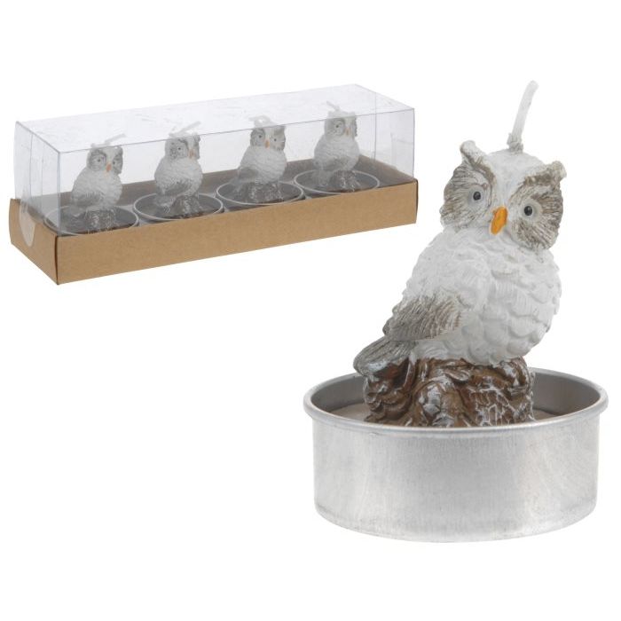 Confezione da 4 candele modellate a forma di gufo. Diametro: 5 cm.