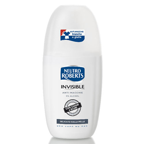 La linea di deodoranti Neutro Roberts Invisible e' approvata sia dai capi chiari che da quelli scuri perché appositamente studiata per ridurre gli aloni gialli e le macchie bianche: la sua speciale formula presenta un ridotto contenuto di antitraspiranti, i principali responsabili delle macchie gialle sui tessuti chiari e delle macchie bianche sui tessuti scuri.Delicati sulla pelle, sono arricchiti con Vitamina E. La formula, inoltre, garantisce un'efficacia deodorante prolungata per 24h.