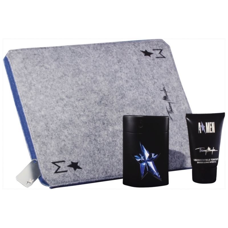 Thierry Mugler A*Men ha una dimensione boisé con un' anima profonda e potente. Una combinazione di menta e lavanda, con patchouli e cedro. Il flacone, in vetro e rivestito in gomma, si ispira ad una bottiglia di whisky. Famiglia olfattiva: orientale.