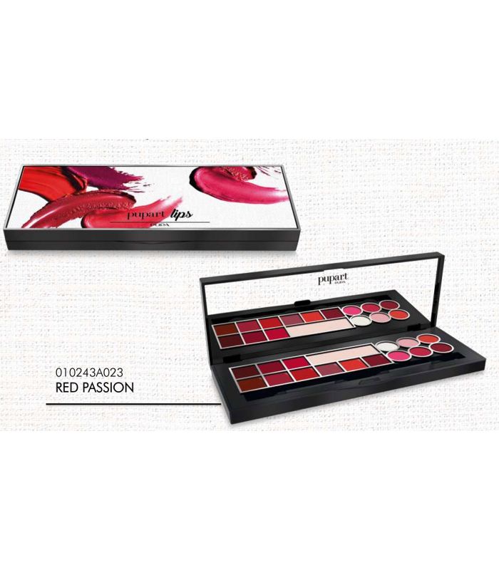 PUPA TROUSSE PUPART LIPS 023 S RED PASSION CHE CONTIENE: 1 Primer, 3 ROSSETTI FINITITURA OPACA MAT, 3 Rossetti tradizionali, 3 Rossetti brillanti, 6 Brillantini labbra, 2 pennelli applicatori