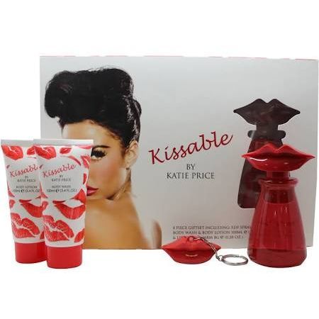 Katie Price Kissable Confezione Regalo 100 ml EDP + 100 ml Bagnoschiuma & Shampoo + 100 ml Lozione Corpo + Lucidalabbra Donna: Kissable di Katie Price é un profumo che contiene note di uva, mandarino, prugna, fiori d'arancio, caprifoglio, gelsomino, vaniglia, legno di sandalo e ambra. Kissable di Katie Price è stato lanciato nel 2013.