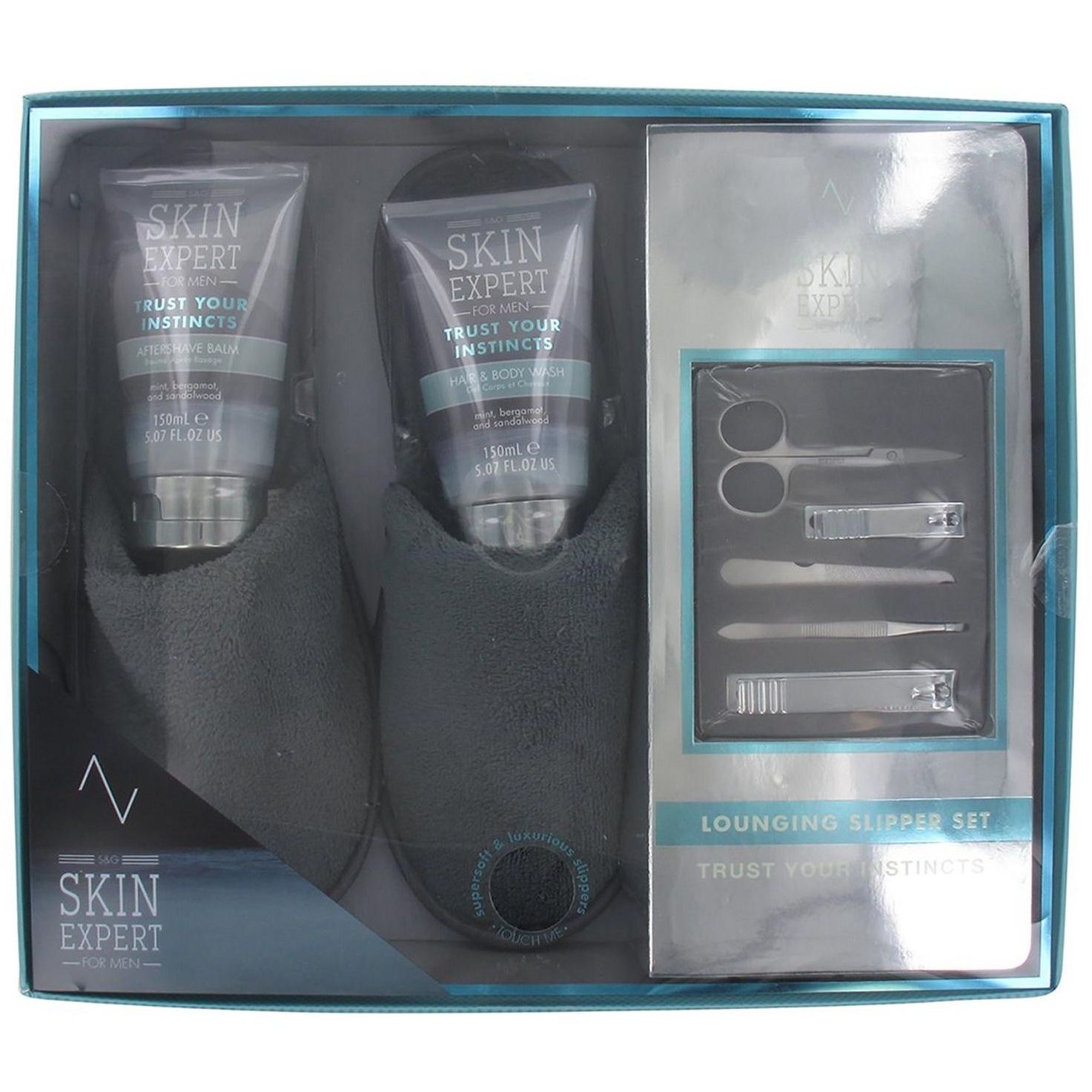 Style & Grace Confezione Regalo Skin Expert Mens Lounging Slipper Uomo include: un gel doccia e capelli 150 ml; un balsamo dopobarba 150 ml; un paio di eleganti pantofole grigie; un kit per la cura delle mani e dei piedi.