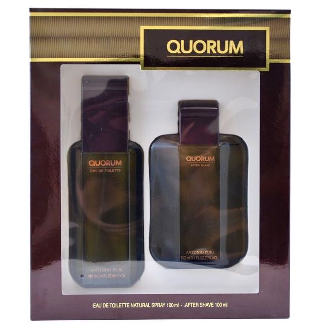 Antonio Puig Quorum Confezione Regalo 100 ml edt + 100 ml Dopobarba Uomo: Antonio Puig Quorum si apre con note di testa a base di Carvi, Pompelmo, Limone, Artemisia e Bergamotto, proseguendo con un cuore di Patchouli, Gelsomino, Ciclamino, Pino, Sandalo e Garofano. La fragranza si chiude con un fondo a base di Ambra, Cuoio, Tabacco e Muschio di Quercia. Con Quorum, Puig propone un' Eau de Toilette dai toni decisamente mascolini e virili. La combinazione di note legnose e aromatiche ha reso questo profumo assolutamente intramontabile e sempre contemporaneo.
