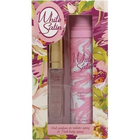 Taylor of London White Satin Confezione Regalo 12 ml edt + 75 ml Spray Corpo Donna: White Satin di Taylor of London contiene note di bergamotto, pompelmo, gelsomino, geranio, rosa, fiori di ciliegio, mughetto, tuberosa, viola, ambra, patchouli, vaniglia cremosa e legno di cedro aromatico.