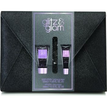 Style & Grace Glitz & Glam Glitter Envelope Confezione Regalo 4 Pezzi contiene: 1 x 30 ml Lozione Mani; 1 x 10 ml Balsamo Labbra; 1 x Lima Per Unghie; 1 x Pochette.
