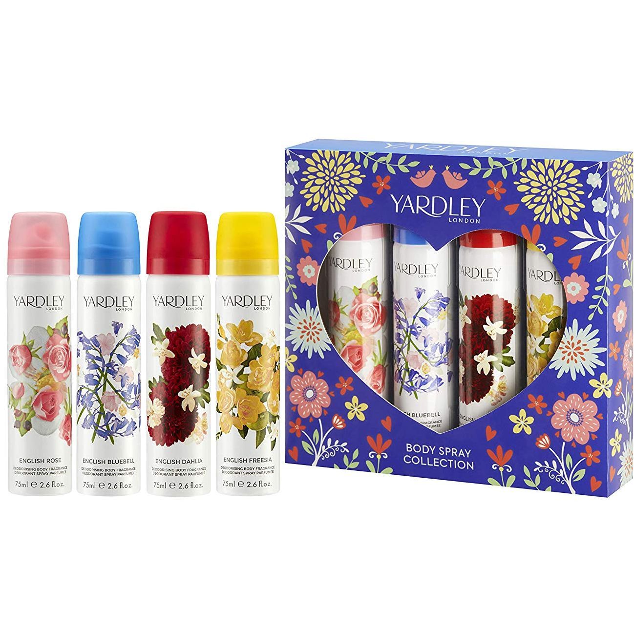 Yardley Body Spray Christmas Confezione Regalo 75 ml English Rose Spray Corpo + 75 ml English Bluebell Spray Corpo + 75 ml English Dahlia Spray Corpo + 75 ml English Freesia Spray Corpo Donna.