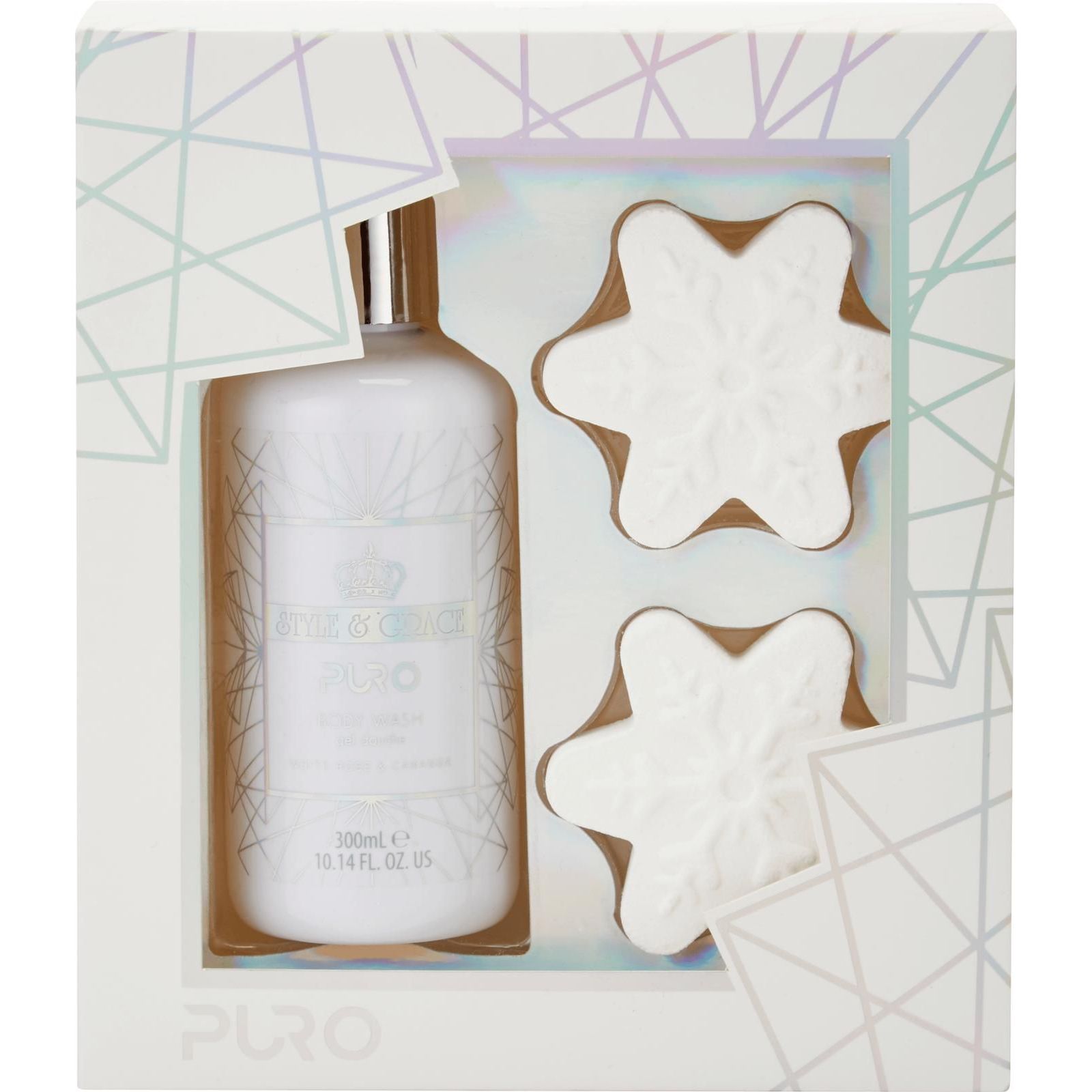 Style & Grace Puro Fizz Set Regalo 300 ml Bagnodoccia + 2 x 50 g Bombe Da Bagno. Rilassati con Puro Fizz di Style & Grace e abbraccia una sensazione di bellezza e pace. La fragranza White Rose e Cananga della gamma Puro è rinfrescante, delicata e leggera. Essa mescola fiori come Rosa, Giglio e Fresia con delicate note fruttate di Litchi e Lampone.