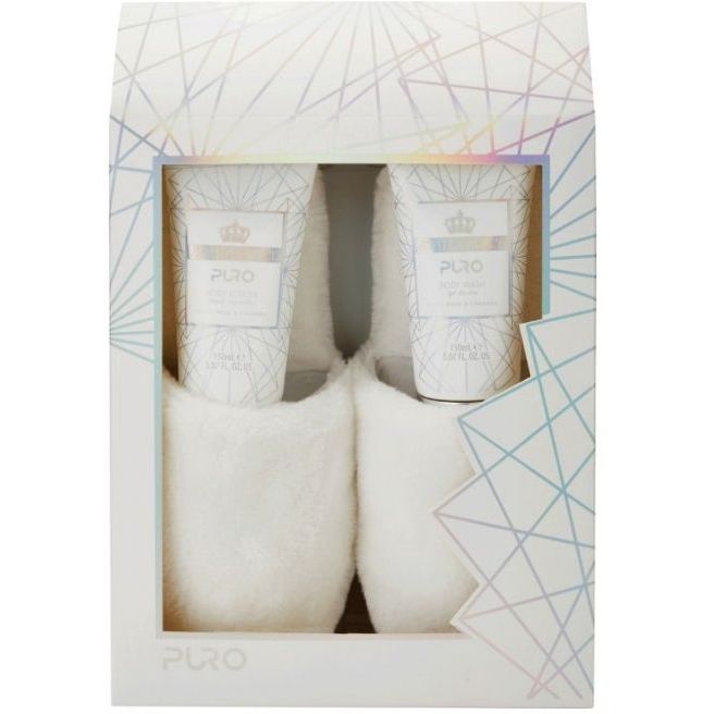Style & Grace Puro Slipper Bag Confezione Regalo 150 ml Bagnodoccia + 150 ml Lozione Corpo + Pantofole. La fragranza White Rose e Cananga della gamma Puro è¨ rinfrescante, delicata e leggera. Essa mescola fiori come Rosa, Giglio e Fresia con delicate note fruttate di Litchi e Lampone.
