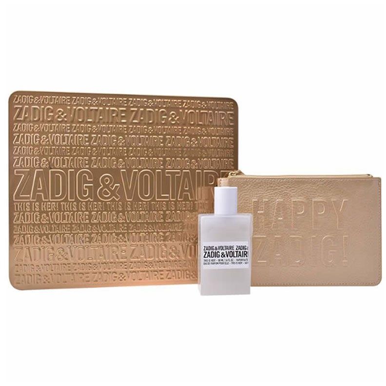 Zadig & Voltaire This is Her Confezione Regalo 50 ml edp + Pochette Dorata Donna. Una nota sensuale di vaniglia e castagna si fonde con la scia rock del legno di sandalo. Il profumo di una donna libera dallo spirito ribelle! Un floreale legnoso e gourmand. La sensualità del gelsomino per il lato rock. La dolcezza dell'abbinamento vaniglia-castagna per il lato romantico. La scia del legno di sandalo, firma di Zadig & Voltaire, per affermare il proprio stile!