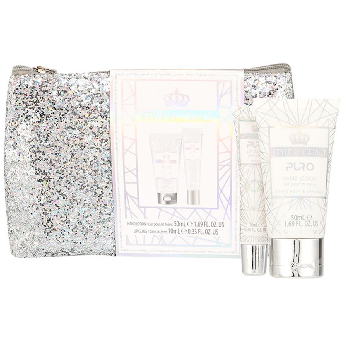 Style & Grace Puro Glitter Bag Confezione Regalo 50 ml Lozione Mani + 10 ml Lip Gloss + Pochette Glitterata.