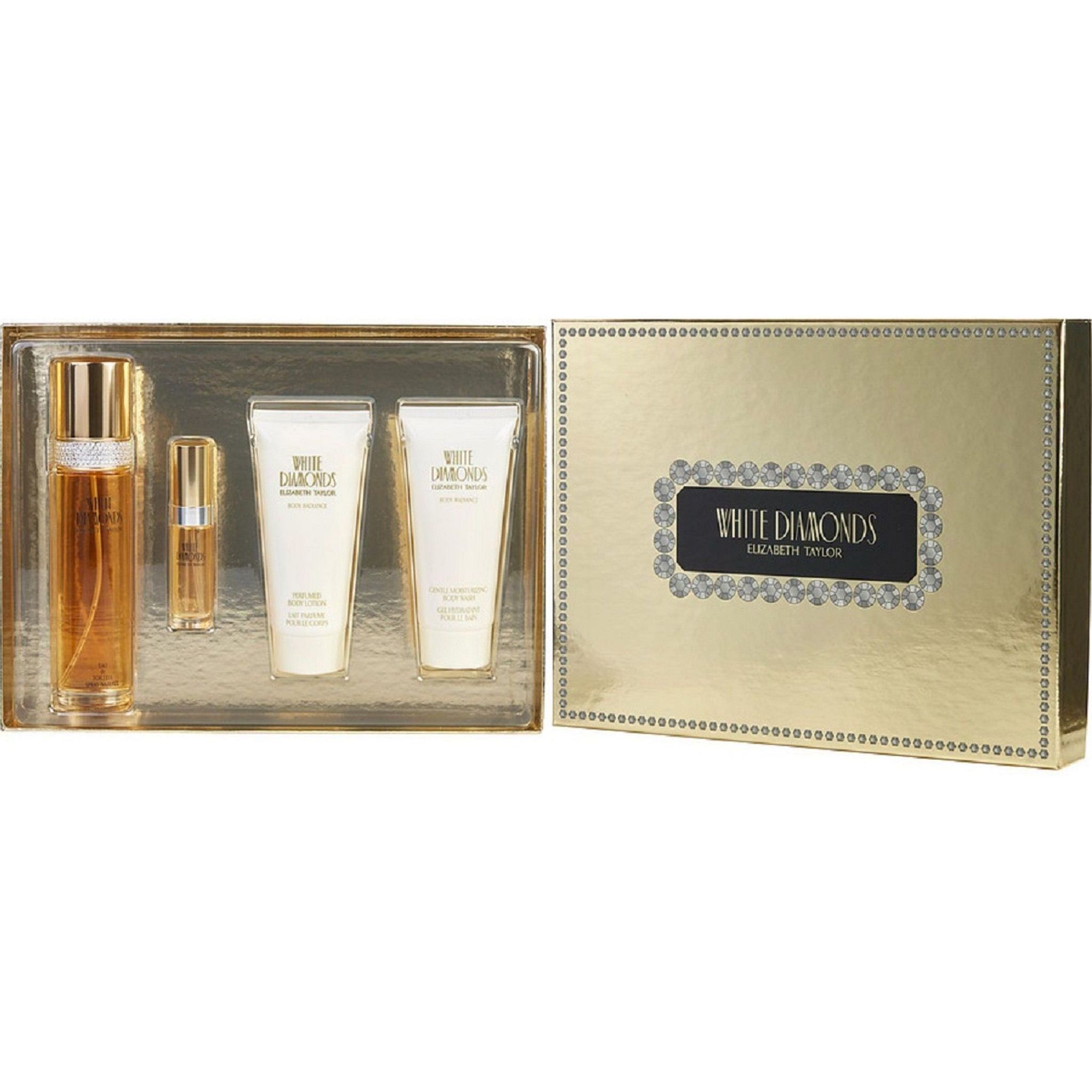 Elizabeth Taylor White Diamonds Confezione Regalo 100 ml edt + 100 ml Lozione Corpo + 100 ml Bagnodoccia + 10 ml edt Donna. White Diamonds di Elizabeth Taylor è una fragranza fresca, floreale e legnosa. Contiene note di neroli, giglio, tuberosa, rosa, iris, narciso, gelsomino, legno di sandalo, patchouli, ambra e muschio di quercia.