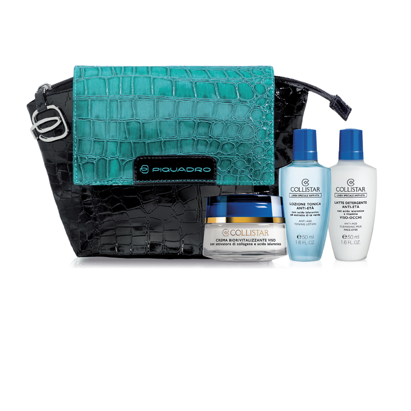 COLLISTAR SPECIALE ANTI-ETA' Confezione Contenente: Crema Biorivitalizzante Viso per tutti i tipi di pelle 50 ml Latte Detergente Anti-Età Viso-Occhi 50 ml Lozione Tonica Anti-Età 50 ml Borsa Piquadro