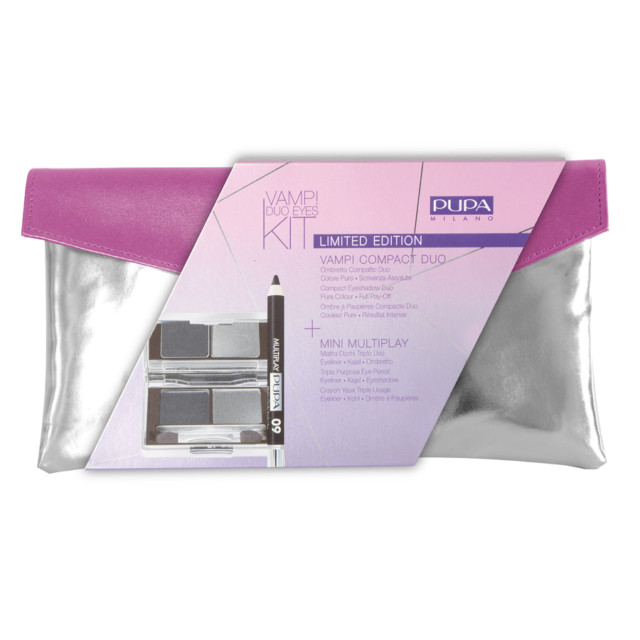 Un kit esclusivo per uno sguardo intenso e profondo. I prodotti sono contenuti in una pochette maxi size perfetta per le serate più chic MINI MULTIPLAY Matita occhi triplo uso: Kajal, Eyeliner e Ombretto Texture a lunga tenuta, ultra scorrevole e di semplicissima applicazione per uno sguardo intenso e seducente. Oftalmologicamente testata. Indicata per occhi sensibili e portatori di lenti a contatto. VAMP! DUO COMPACT EYESHADOW Ombretto Compatto Duo. Colore Puro – Scrivenza assoluta Formula innovativa ad alta concentrazione di pigmenti. Texture cremosa, impalpabile e ultra confortevole dall’elevata sfumabilità e dalla coprenza modulabile. Colore assolutamente omogeneo e uniforme alla prima passata, rimane impeccabile per tutto il giorno.
