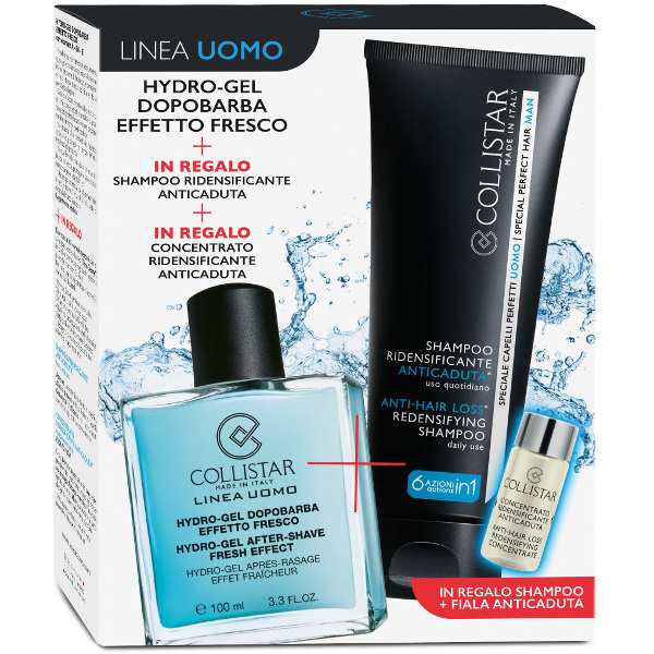 Collistar - Hydro-Gel Dopobarba Effetto Fresco PROMO - 100 ml Dopobarba + 100 ML Shampoo Anticaduta + 6 ML Fiala Anticaduta. Grazie alla sua particolare texture questo dopobarba risulta leggero e di immediato assorbimento. Leggermente alcolico conferisce alla pelle, subito dopo la rasatura, un intenso senso di benessere e freschezza.