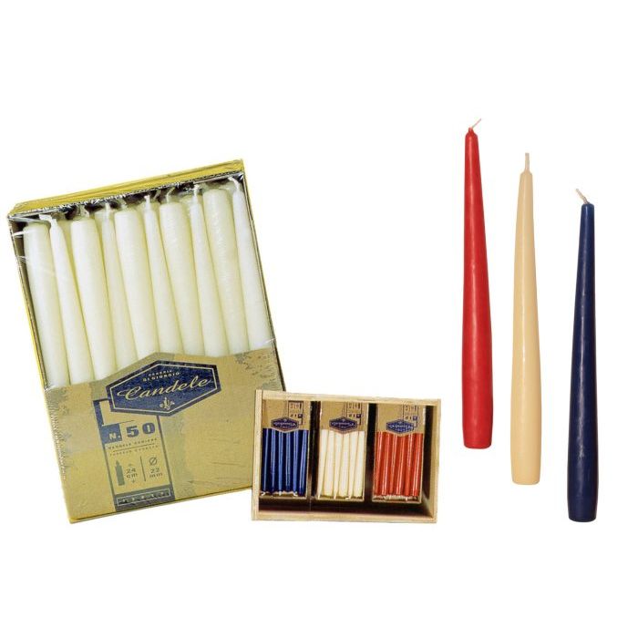 onfezione da 50 candele coniche, lunghezza 25 cm, durata circa 7 ore. Colore Rosso.